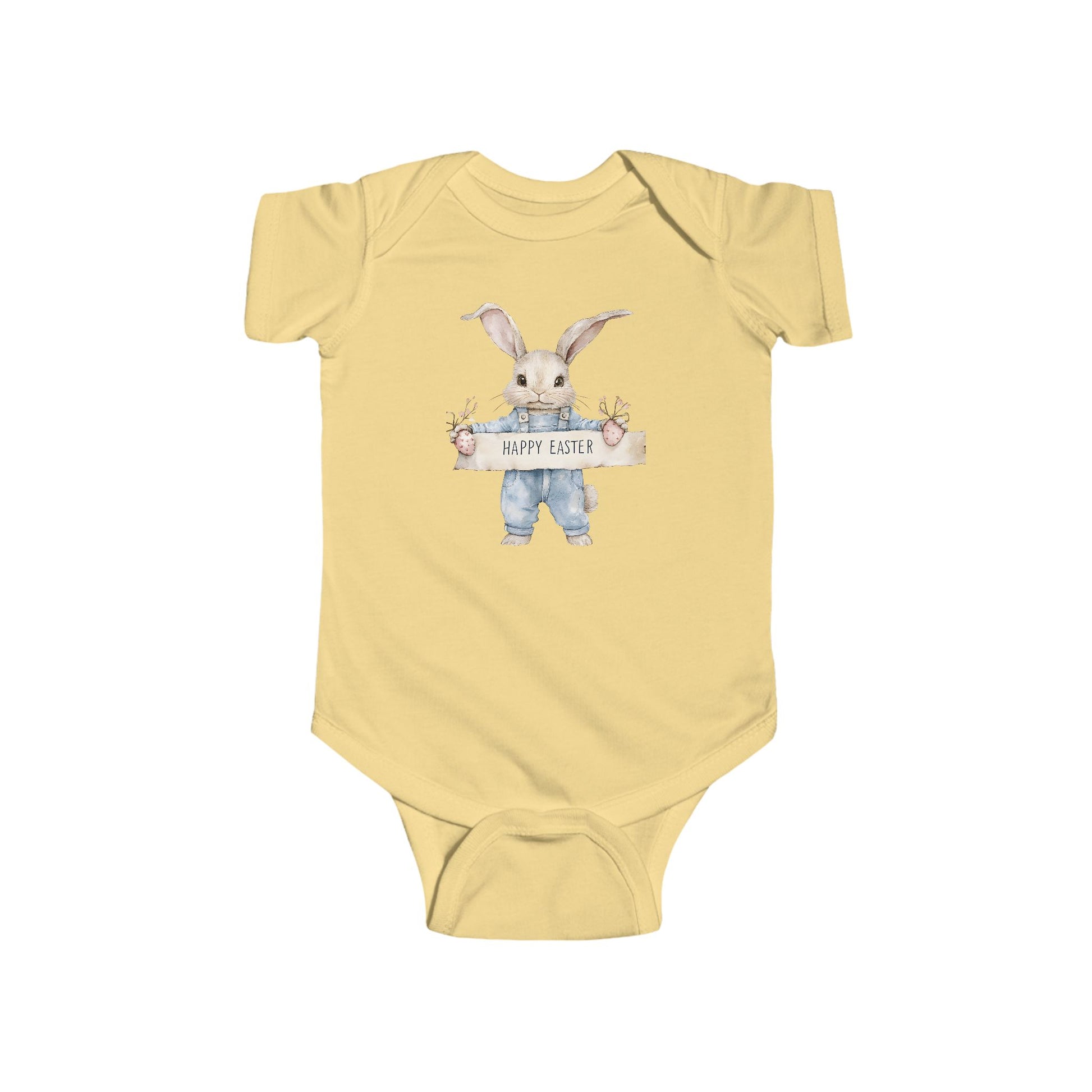 Soft, lightweight infant bodysuit featuring a hand-painted bunny holding a tiny sign—whimsical and gentle against baby's skin. The combed ringspun cotton fabric feels smooth and breathable, while ribbed knit binding at the neck and armholes allows easy movement for wriggly little ones. Side seams keep the shape through washes, and a tear-away label prevents irritation. Matching snaps at the cross closure make diaper changes quick and quiet. This piece settles into everyday life: nap-time cuddles, family photos, and quiet mornings with a warm cup nearby. It reads like a small, thoughtful moment stitched into the wardrobe—sweet, understated, and made to be worn often.