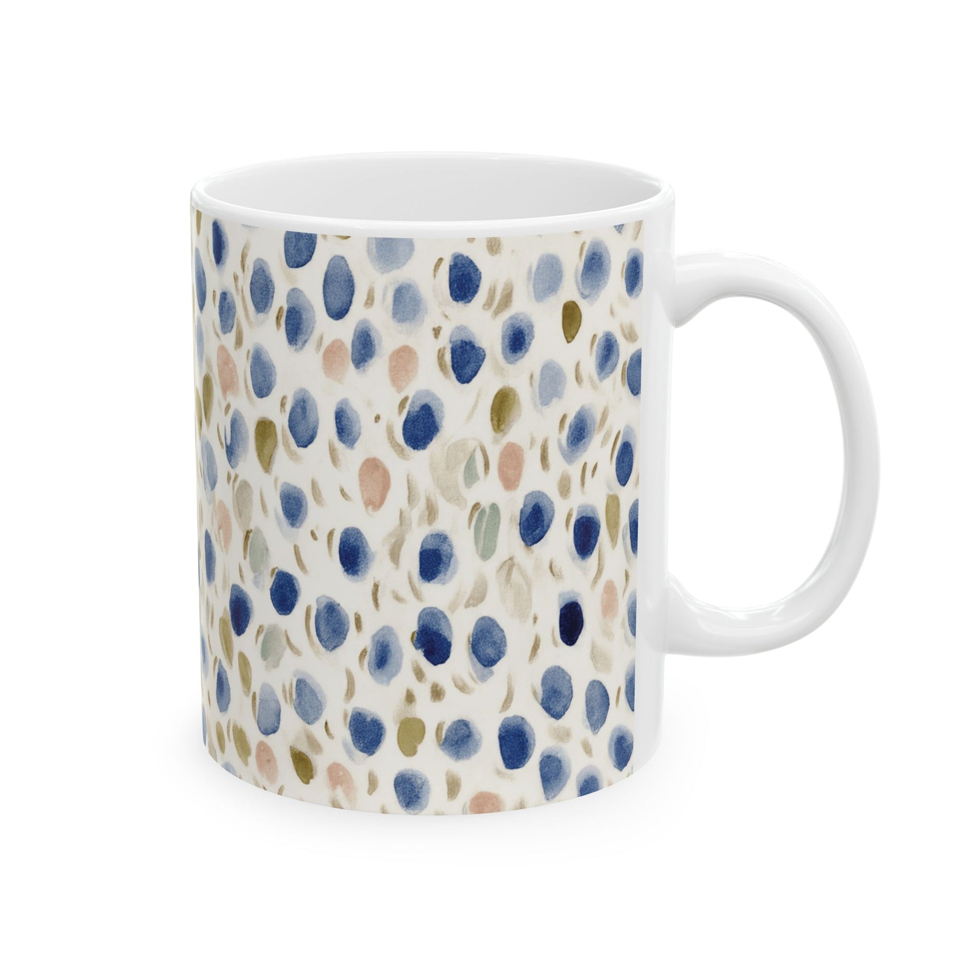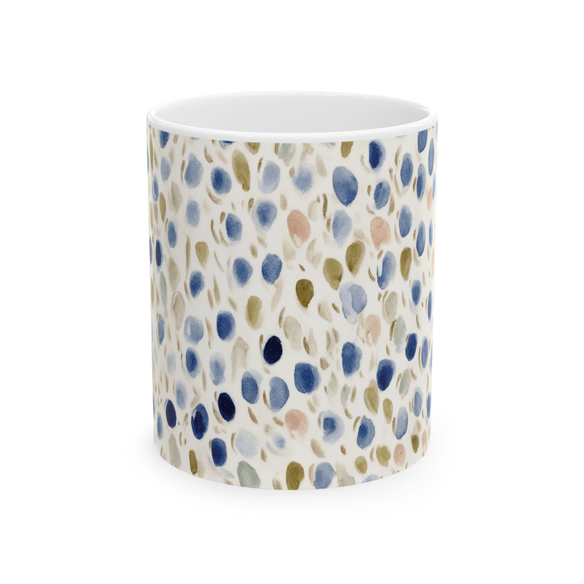 Warm, pared-back, and quietly joyful—this ceramic mug brings soft hand-painted dots and muted coastal colors to your everyday ritual. Each sip feels like a slow morning by the water: gentle blues, seafoam greens, and blush accents scattered across a glossy white canvas. The comfortable C-handle and shiny finish make reaching for it effortless, while the vibrant print stays true through daily use. It slips naturally into a calm kitchen, a studio desk, or a cozy reading nook and pairs especially well with slow weekends, housewarmings, or mindful mornings when you want something simple that still feels special.