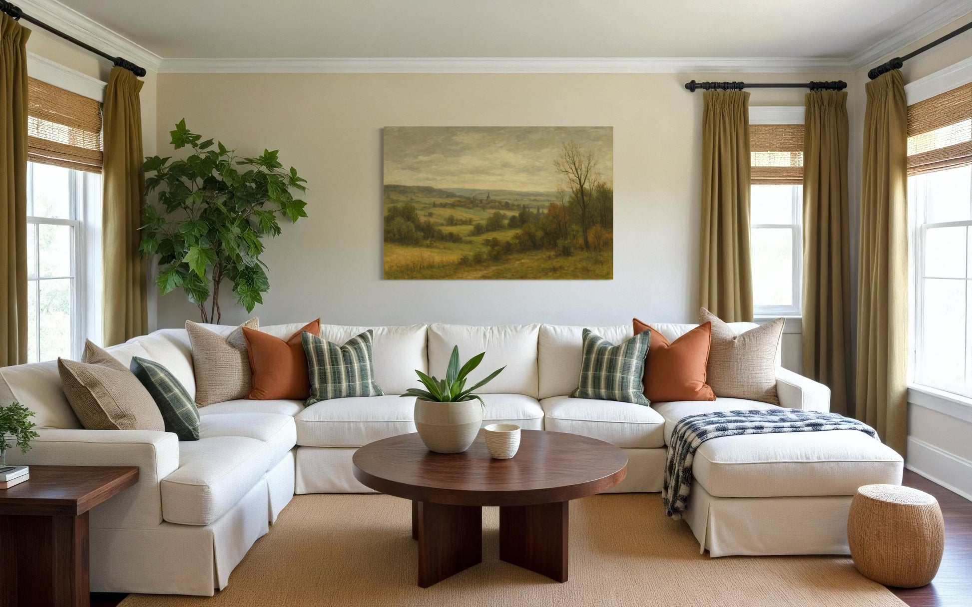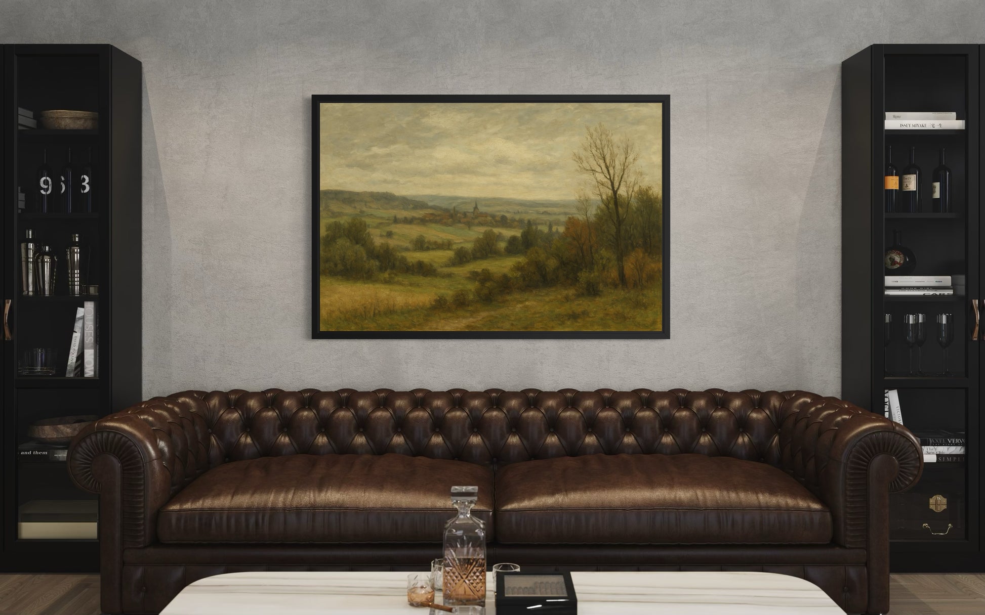 A warm, timeless countryside landscape featuring rolling hills, soft golden light, and distant tree lines. This peaceful scene brings a sense of comfort and classic charm to any space, making it perfect for living rooms, bedrooms, entryways, and traditional or farmhouse décor styles.