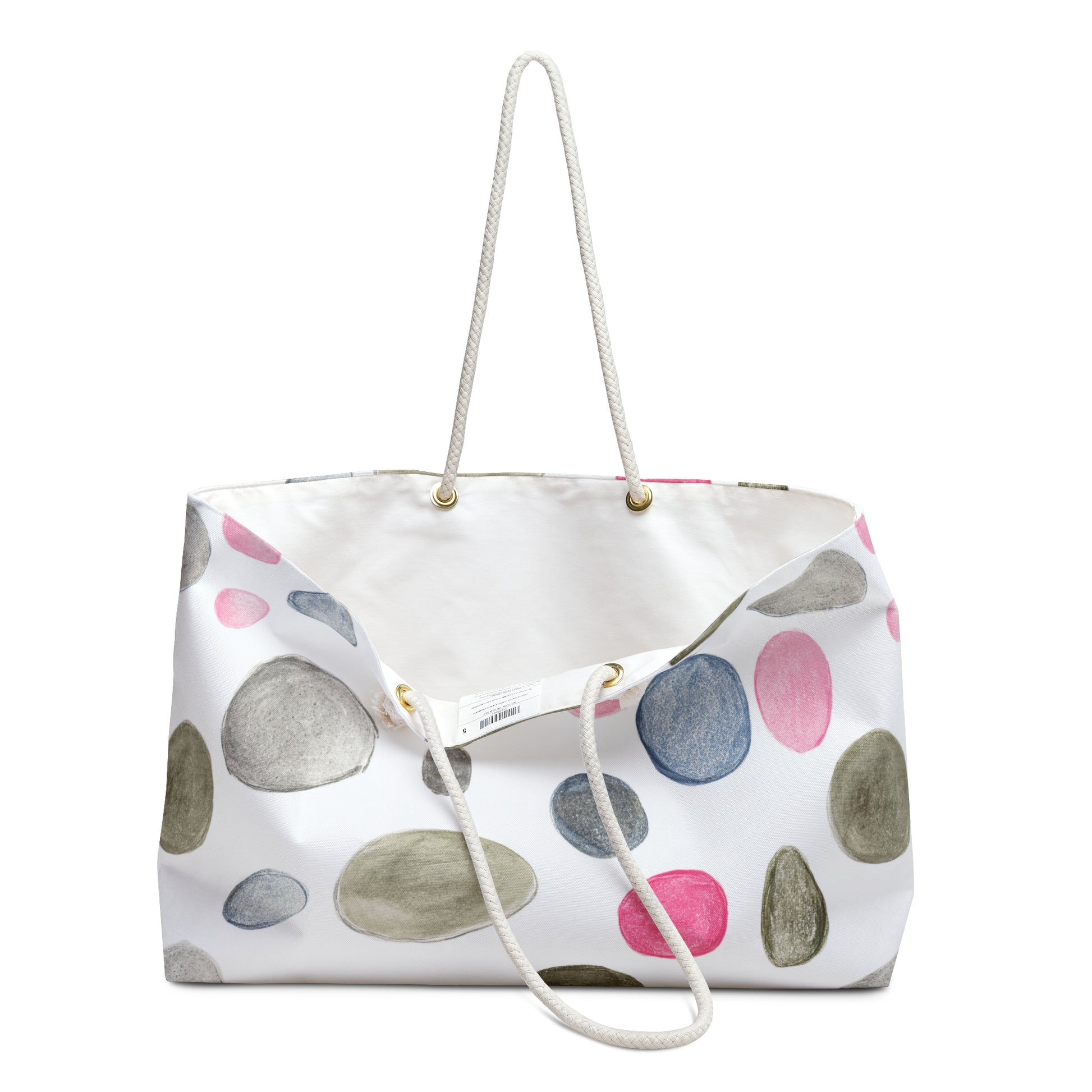 Light and airy with a hand-painted feel, this roomy weekender carries the soft calm of watercolor stones. The cream rope handles sit comfortably on the shoulder while the T-bottom gives structure for towels, a sweater, and a paperback. Inside, a smooth cream lining keeps things neat; outside, the printed polyester resists wrinkles so the painted pebble pattern stays fresh from car to coast. Bring it to a weekend by the sea, a friend's cottage, or a slow-paced market morning — it’s made to feel lived-in and easy from the first pull of the rope.