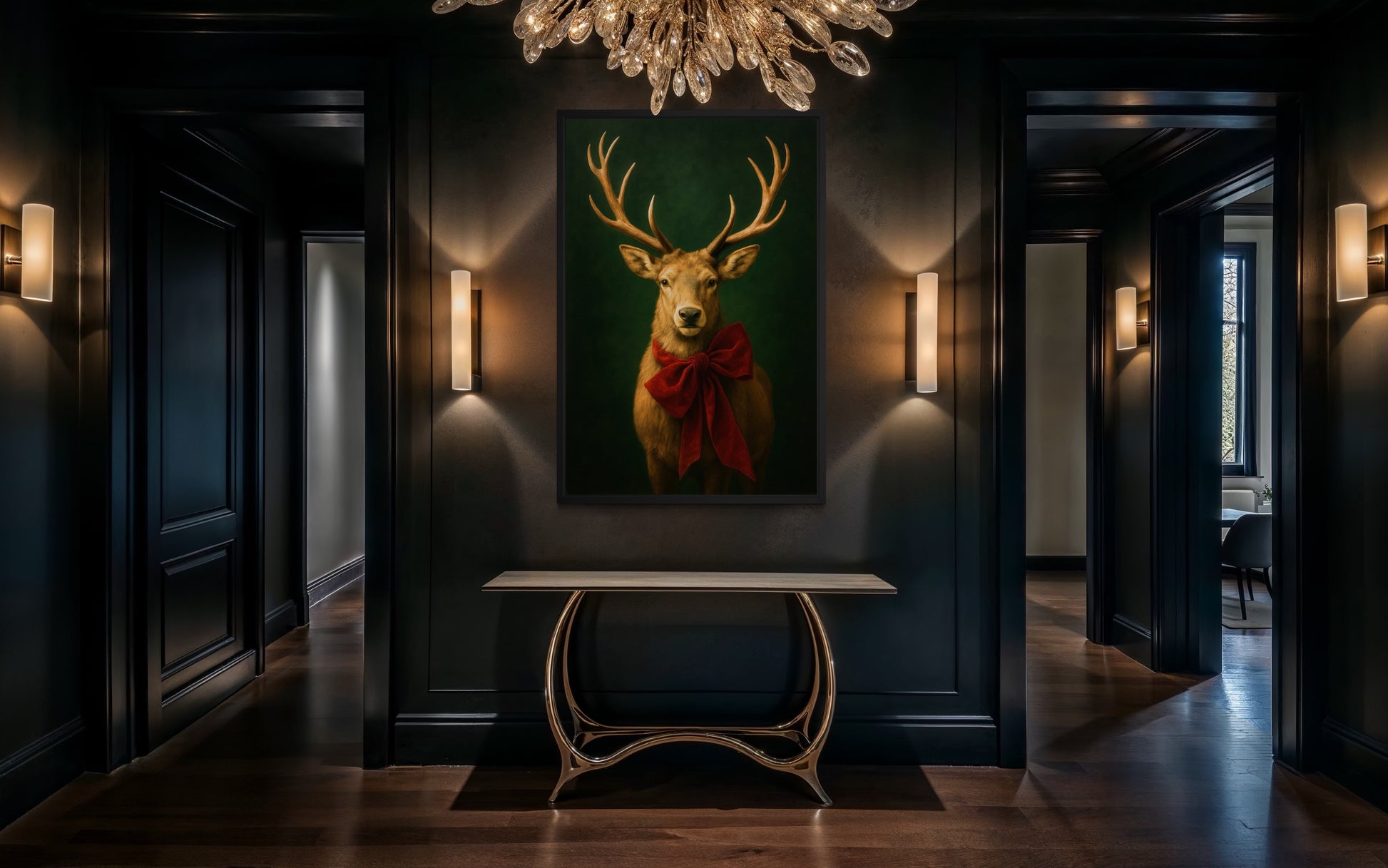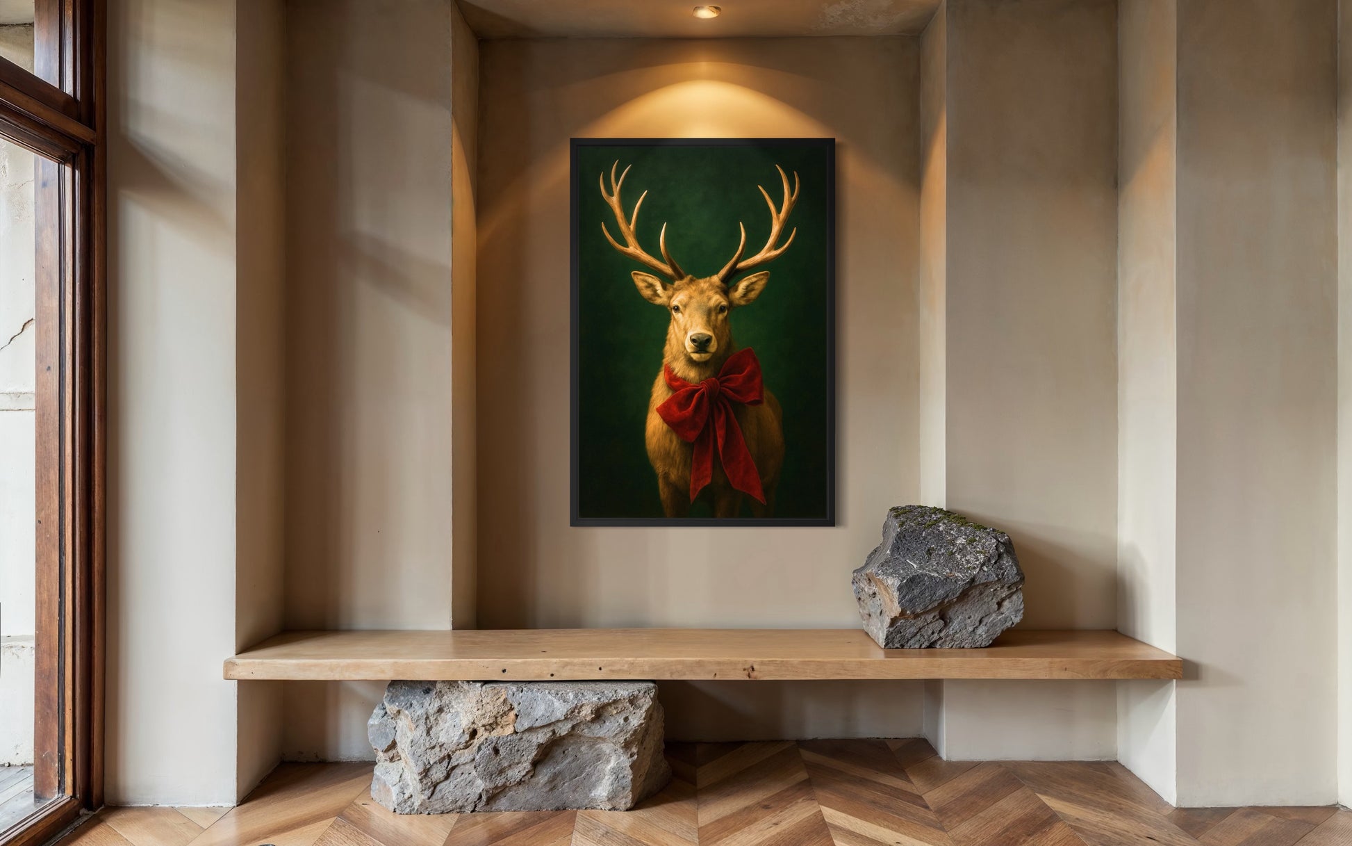Bring classic holiday charm into your home with this vintage-inspired portrait of a regal stag dressed in a deep red bow. Rich forest-green tones and warm lighting give this artwork a timeless, woodland elegance perfect for Christmas decorating, cabin décor, or cozy winter interiors.