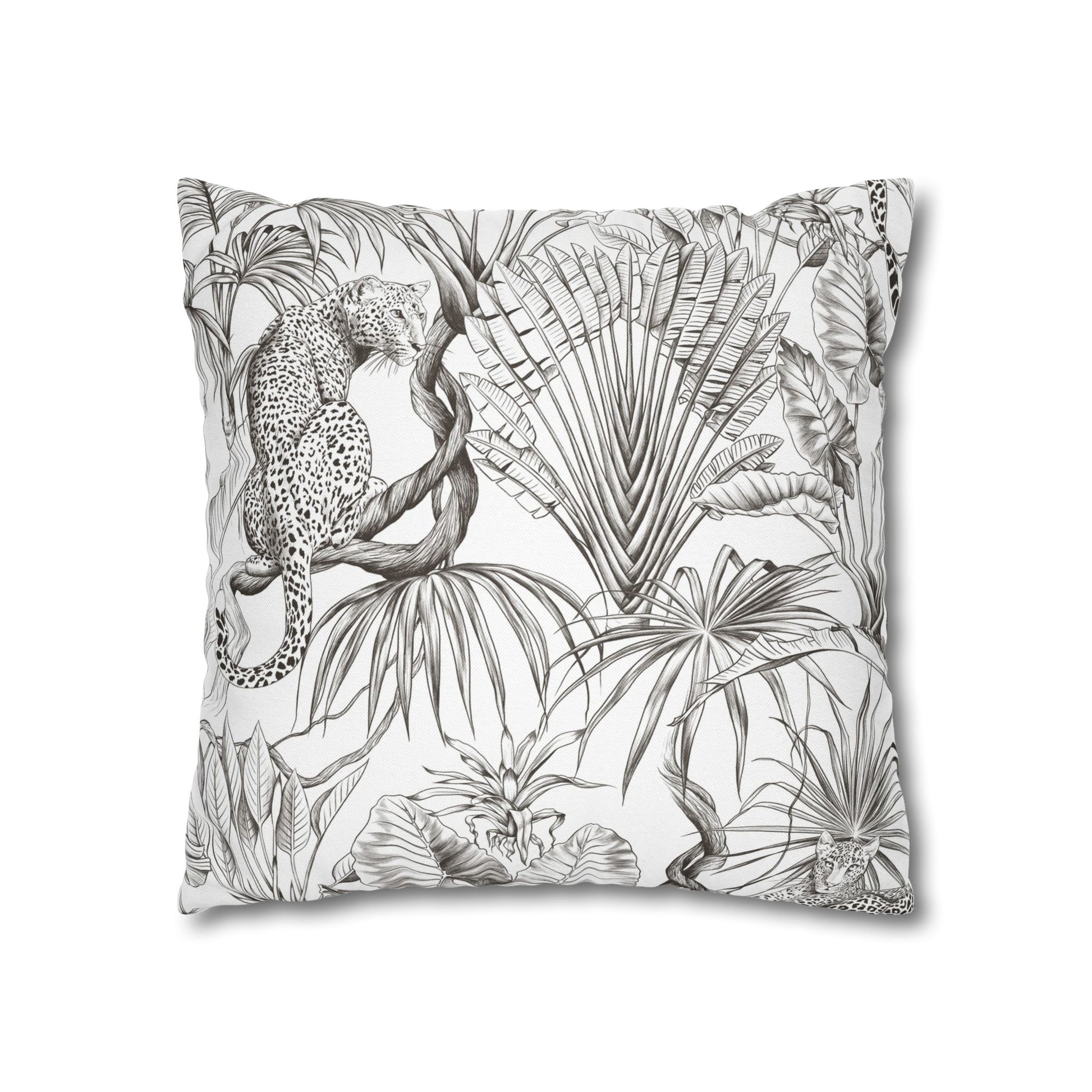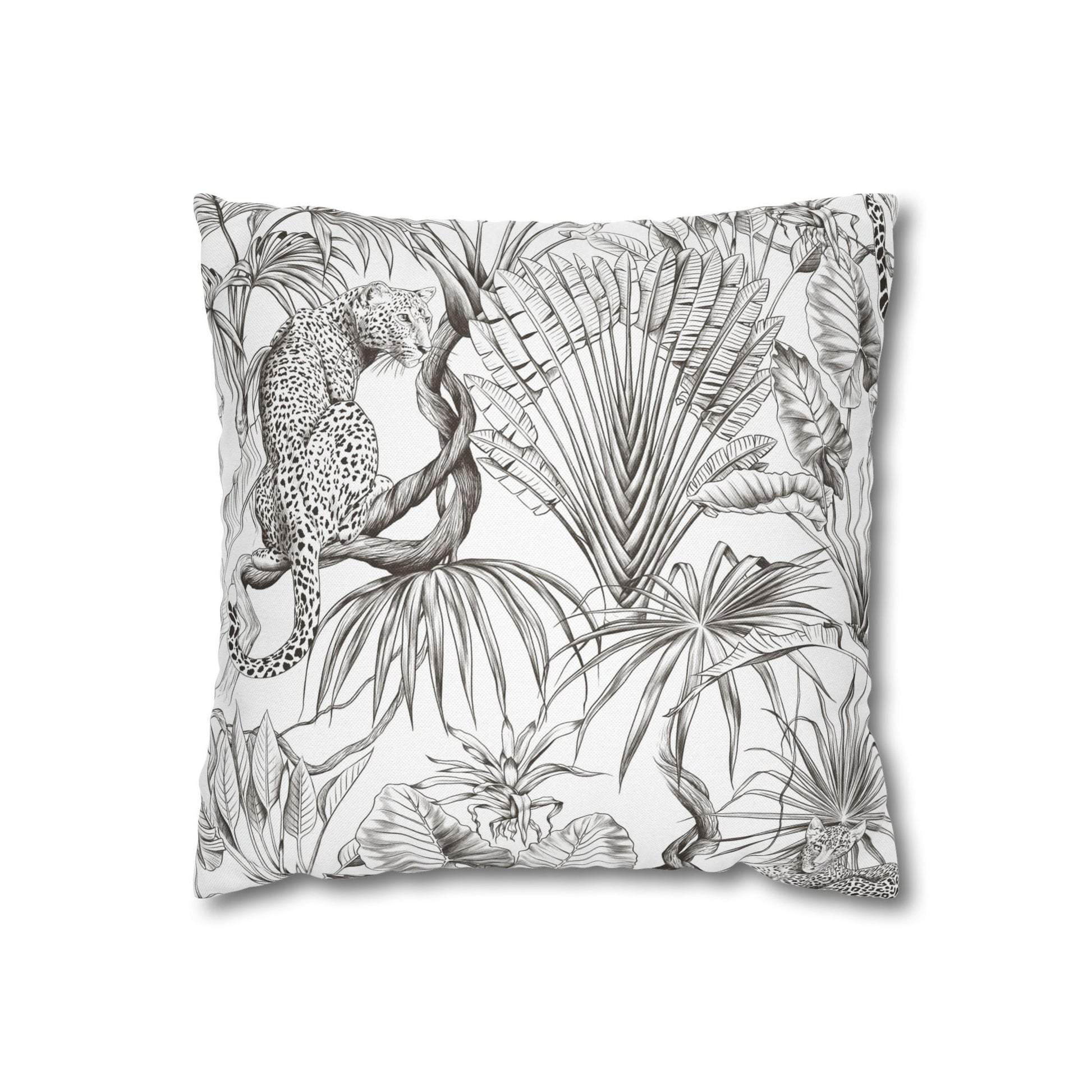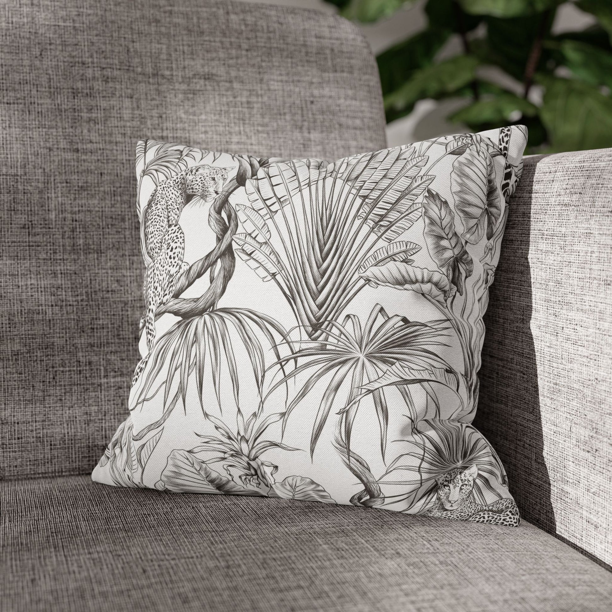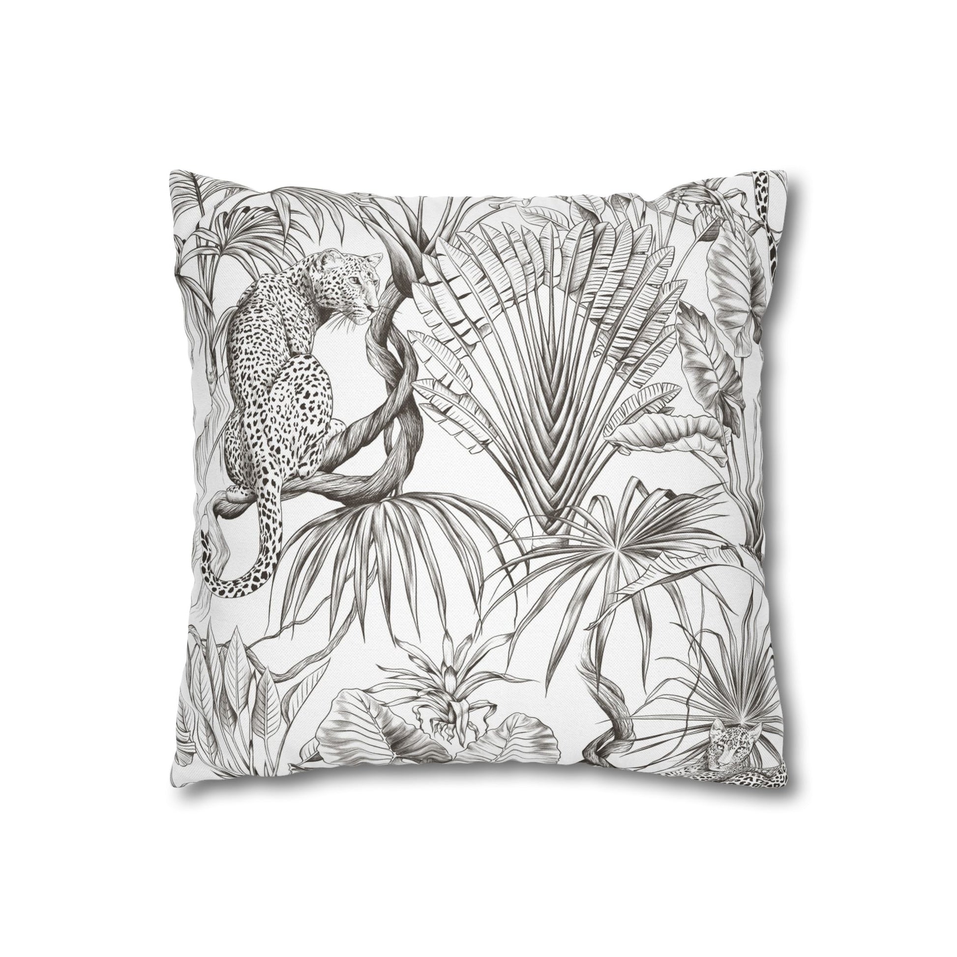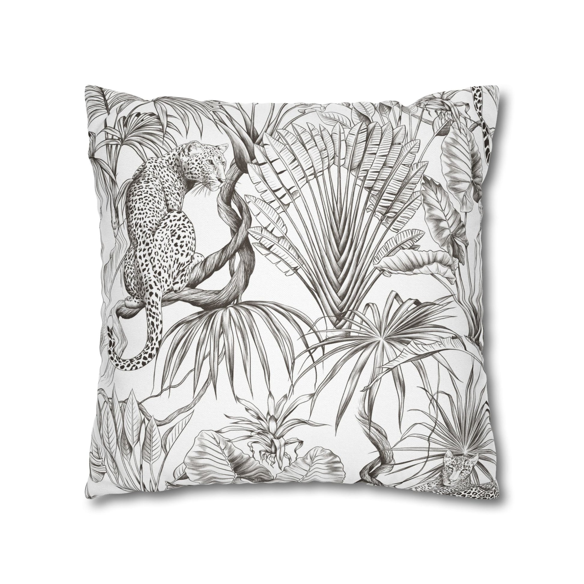Hand-drawn jungle meets modern calm. This square pillow cover wraps a room in soft graphite tones — detailed palms, twisting vines and a relaxed leopard sketched in fine linework. The double-sided print keeps the look consistent from every angle, while the neutral palette blends easily with linen, rattan, or clean white sofas. Slip it over your favorite insert to add an artisanal, quietly wild accent to a reading nook, bedroom, or sunlit living room. The concealed zipper keeps the silhouette smooth and the beige zipper head stays visually subtle against the design.