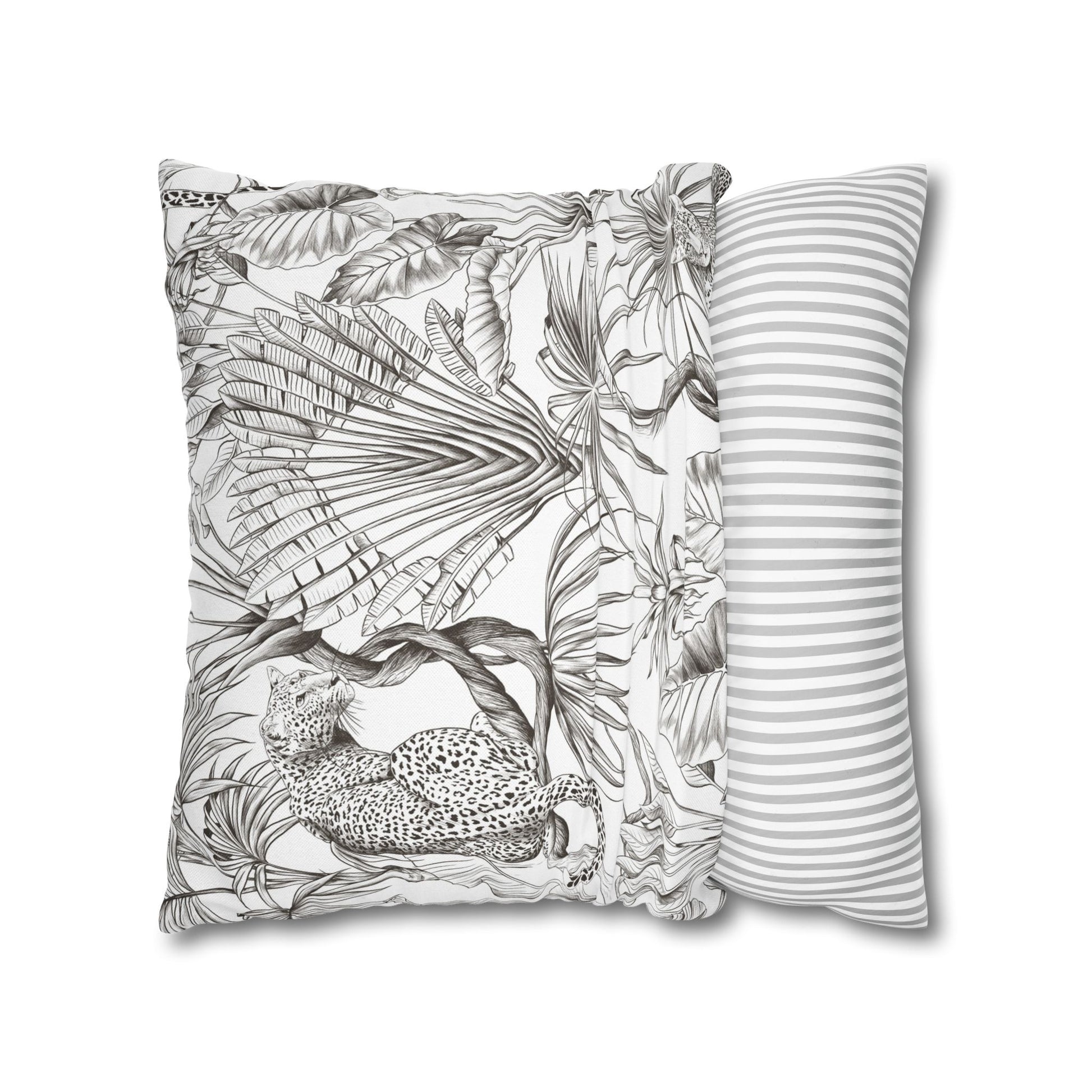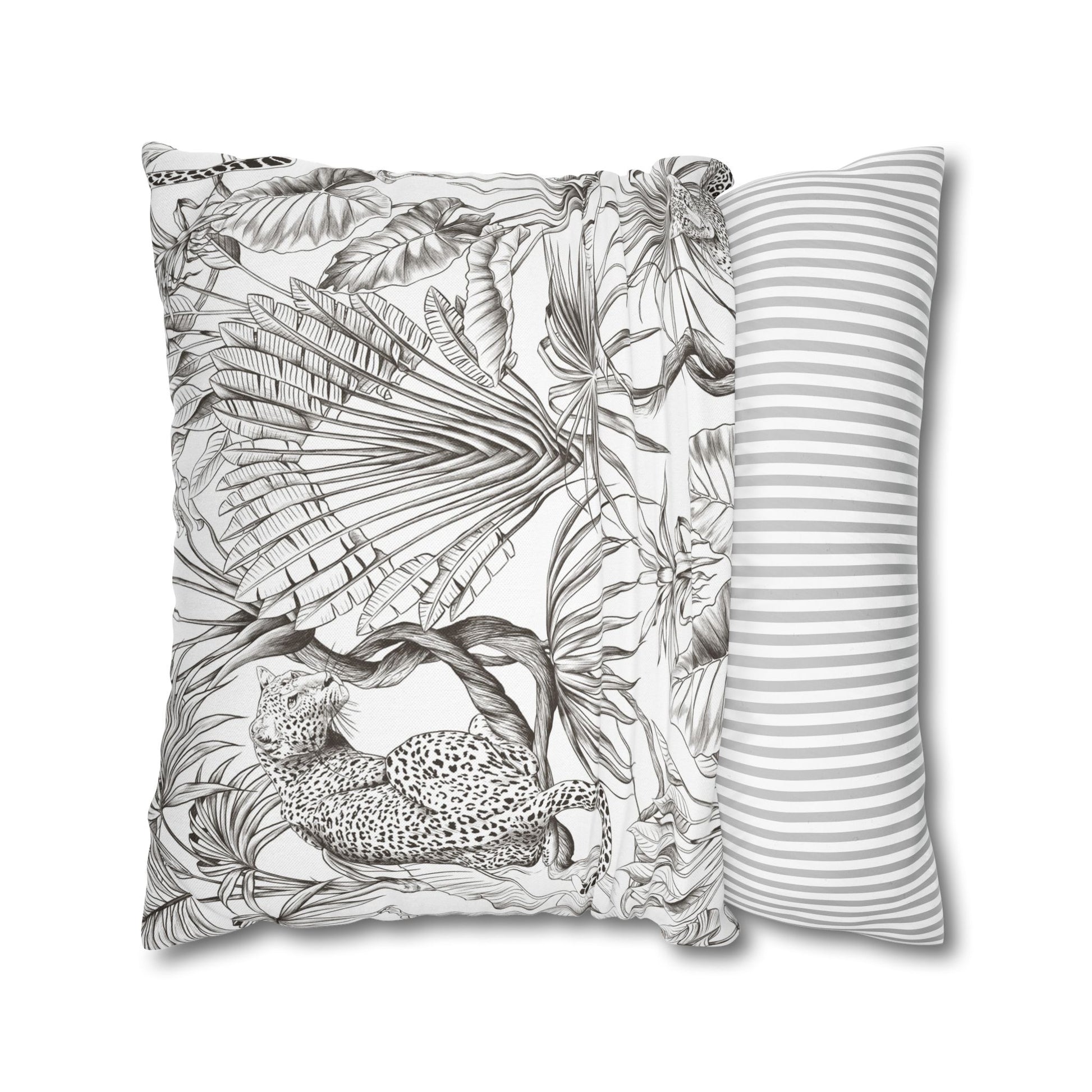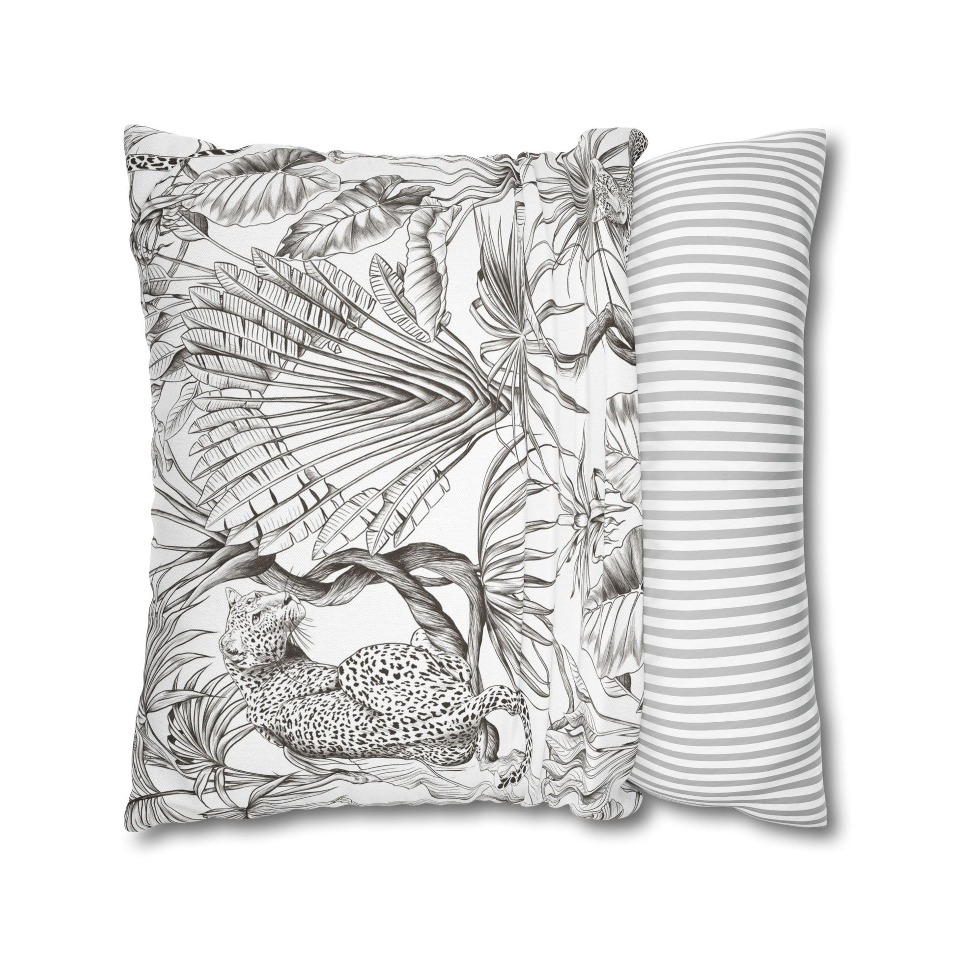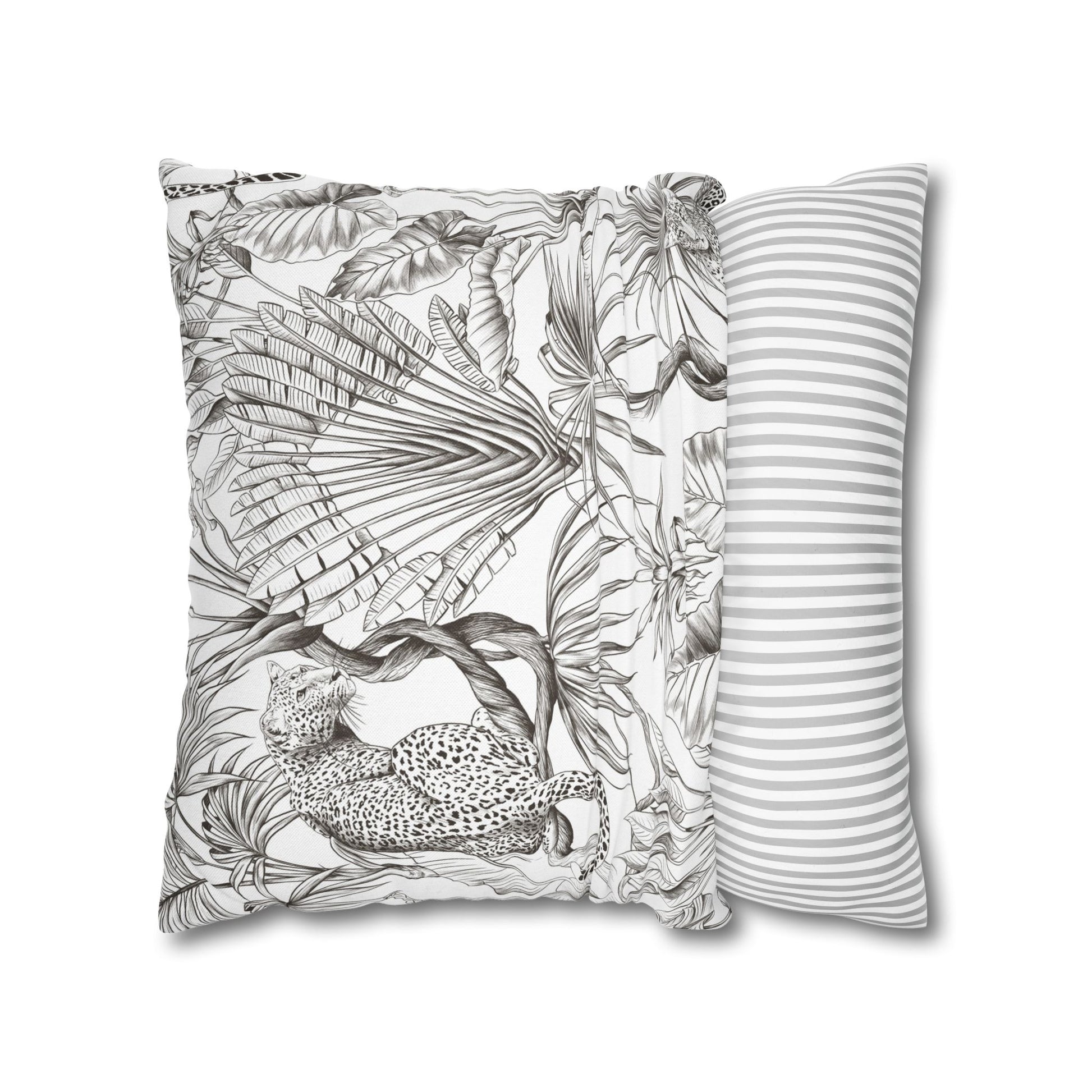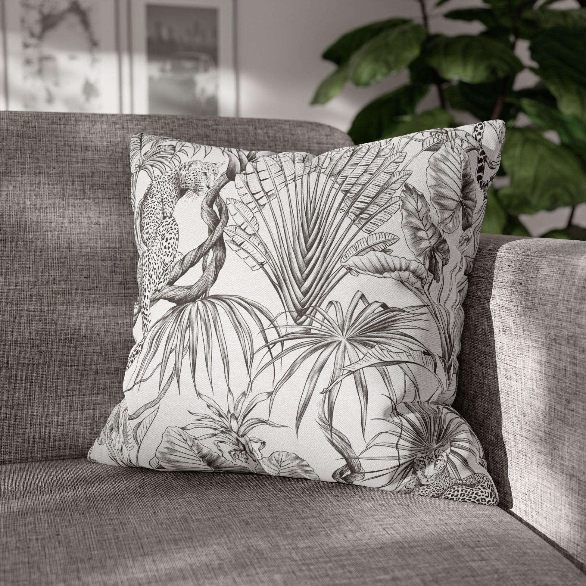 Hand-drawn jungle meets modern calm. This square pillow cover wraps a room in soft graphite tones — detailed palms, twisting vines and a relaxed leopard sketched in fine linework. The double-sided print keeps the look consistent from every angle, while the neutral palette blends easily with linen, rattan, or clean white sofas. Slip it over your favorite insert to add an artisanal, quietly wild accent to a reading nook, bedroom, or sunlit living room. The concealed zipper keeps the silhouette smooth and the beige zipper head stays visually subtle against the design.
