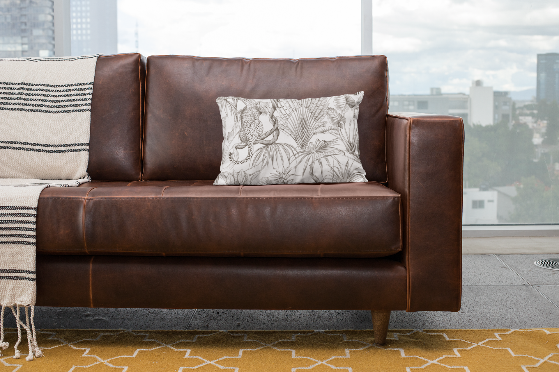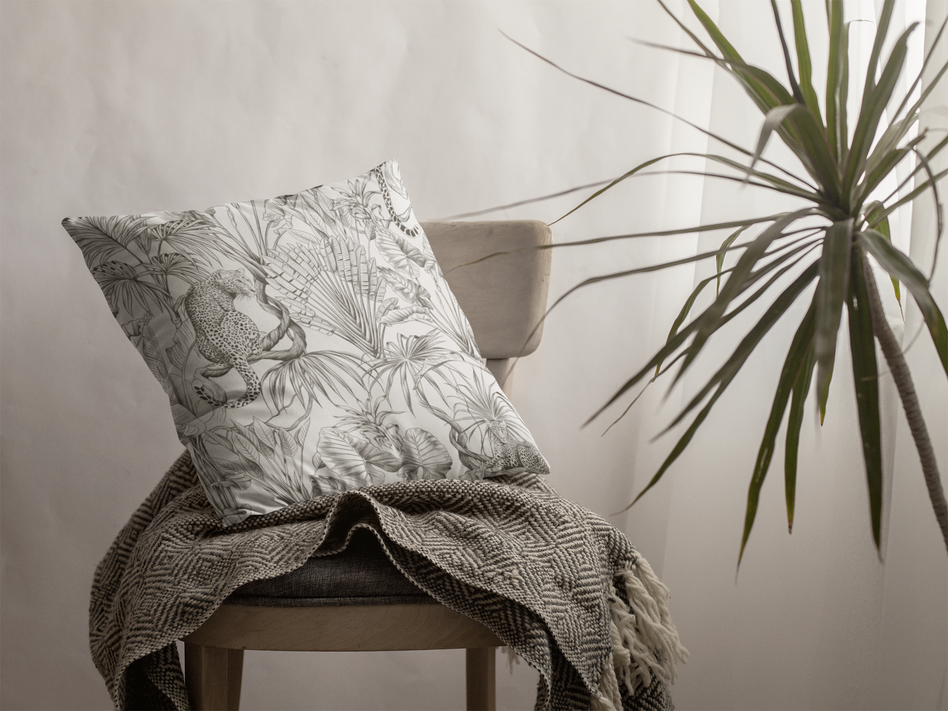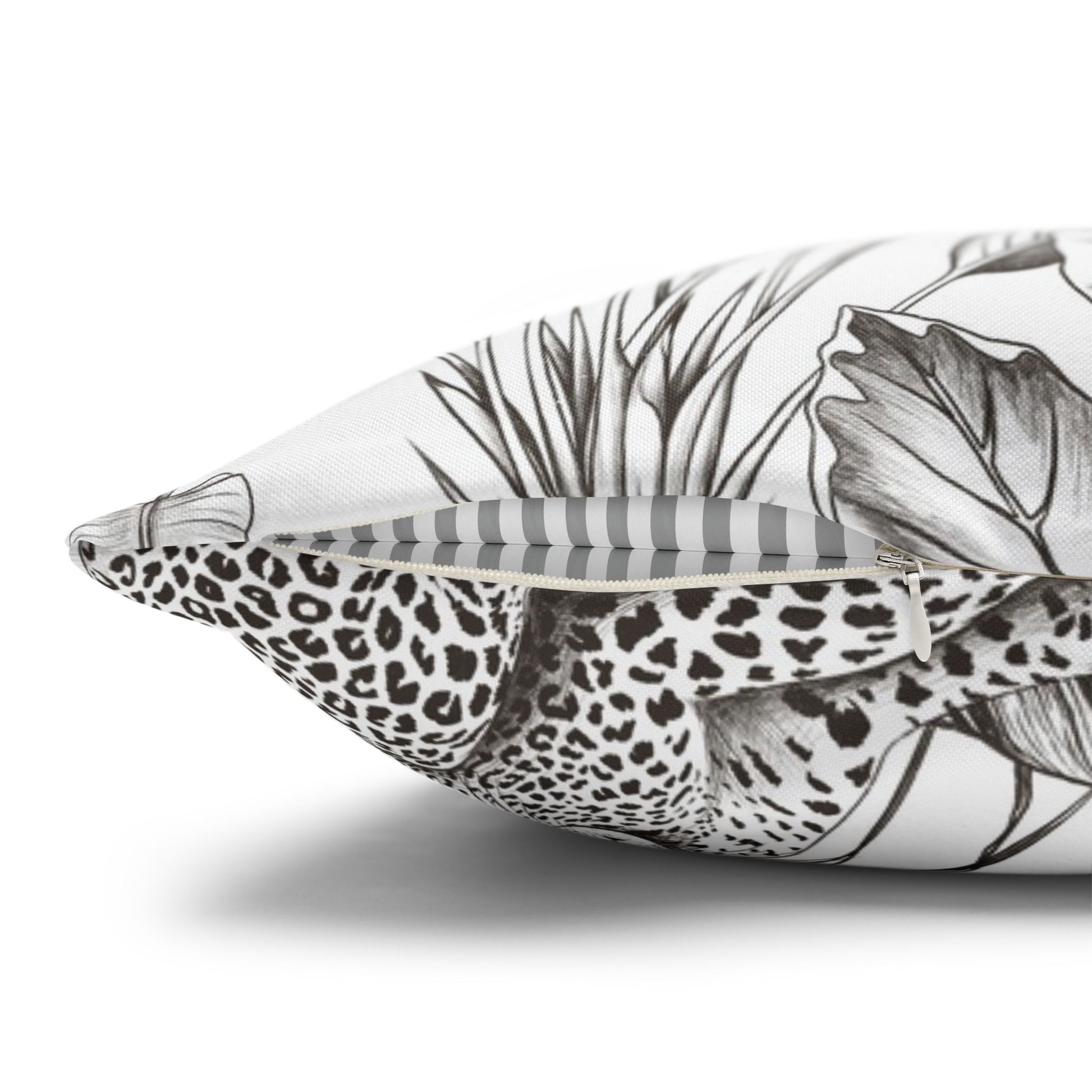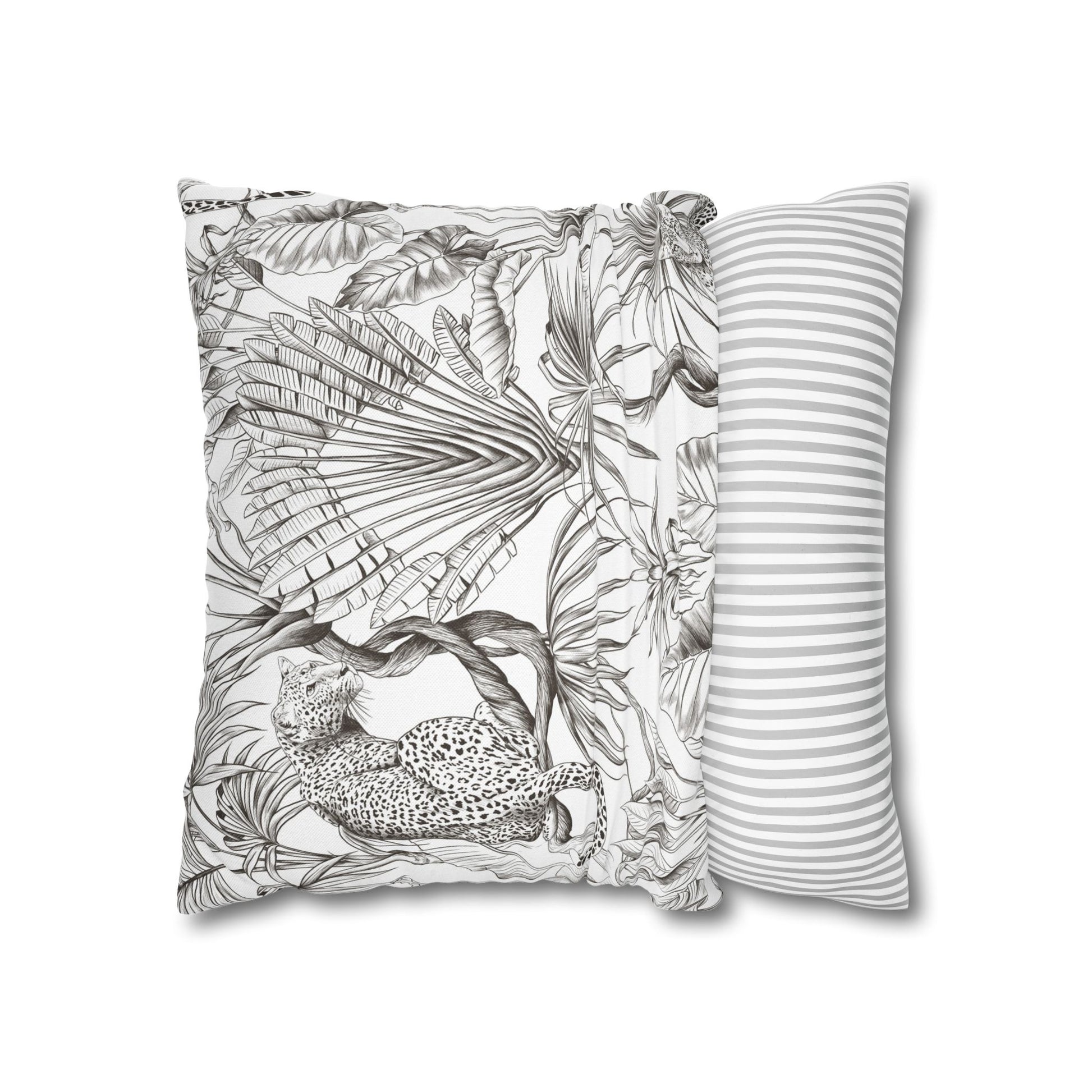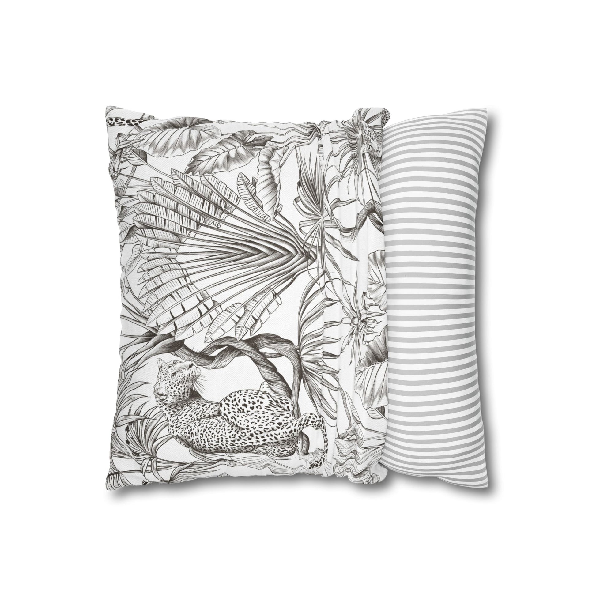 Hand-drawn jungle meets modern calm. This square pillow cover wraps a room in soft graphite tones — detailed palms, twisting vines and a relaxed leopard sketched in fine linework. The double-sided print keeps the look consistent from every angle, while the neutral palette blends easily with linen, rattan, or clean white sofas. Slip it over your favorite insert to add an artisanal, quietly wild accent to a reading nook, bedroom, or sunlit living room. The concealed zipper keeps the silhouette smooth and the beige zipper head stays visually subtle against the design.