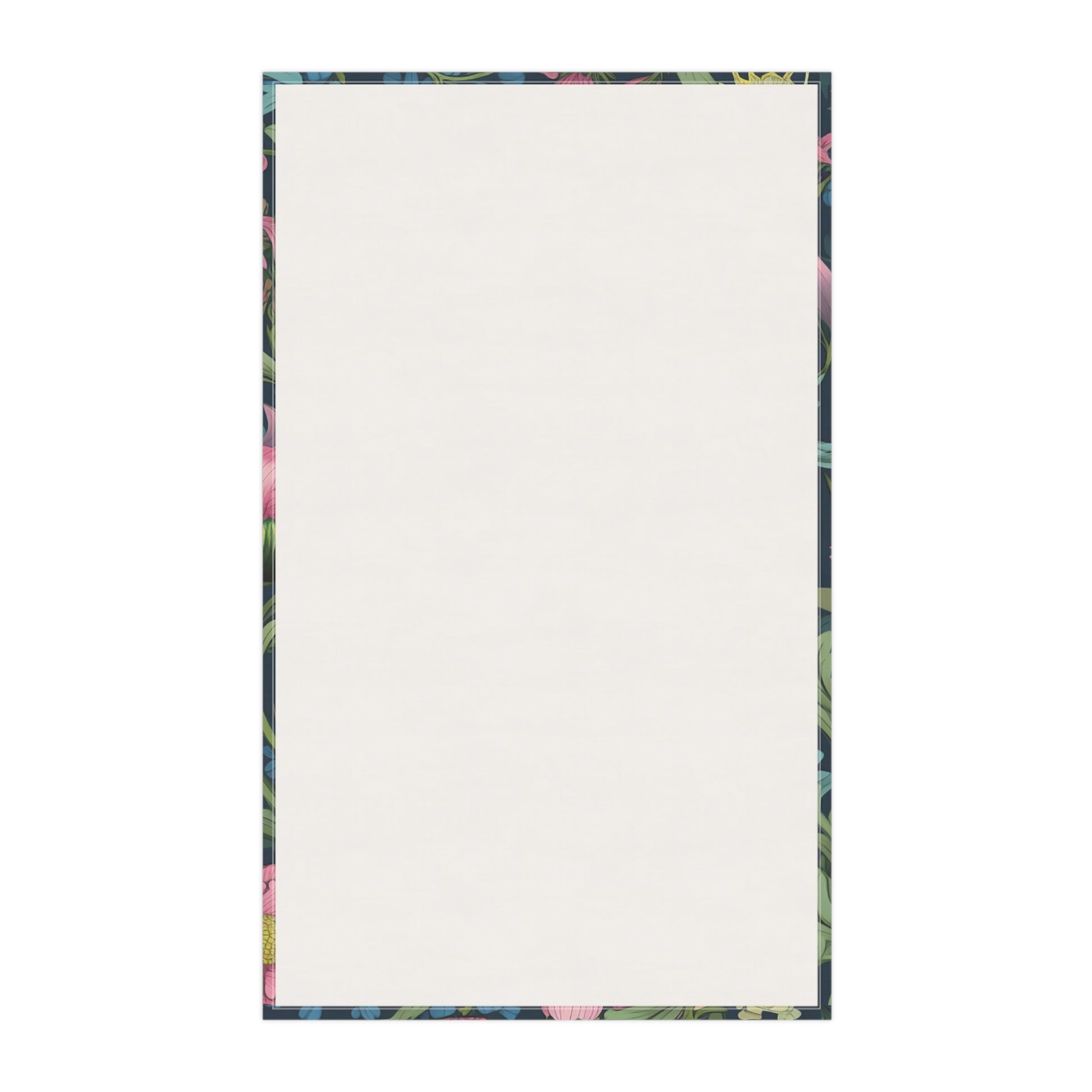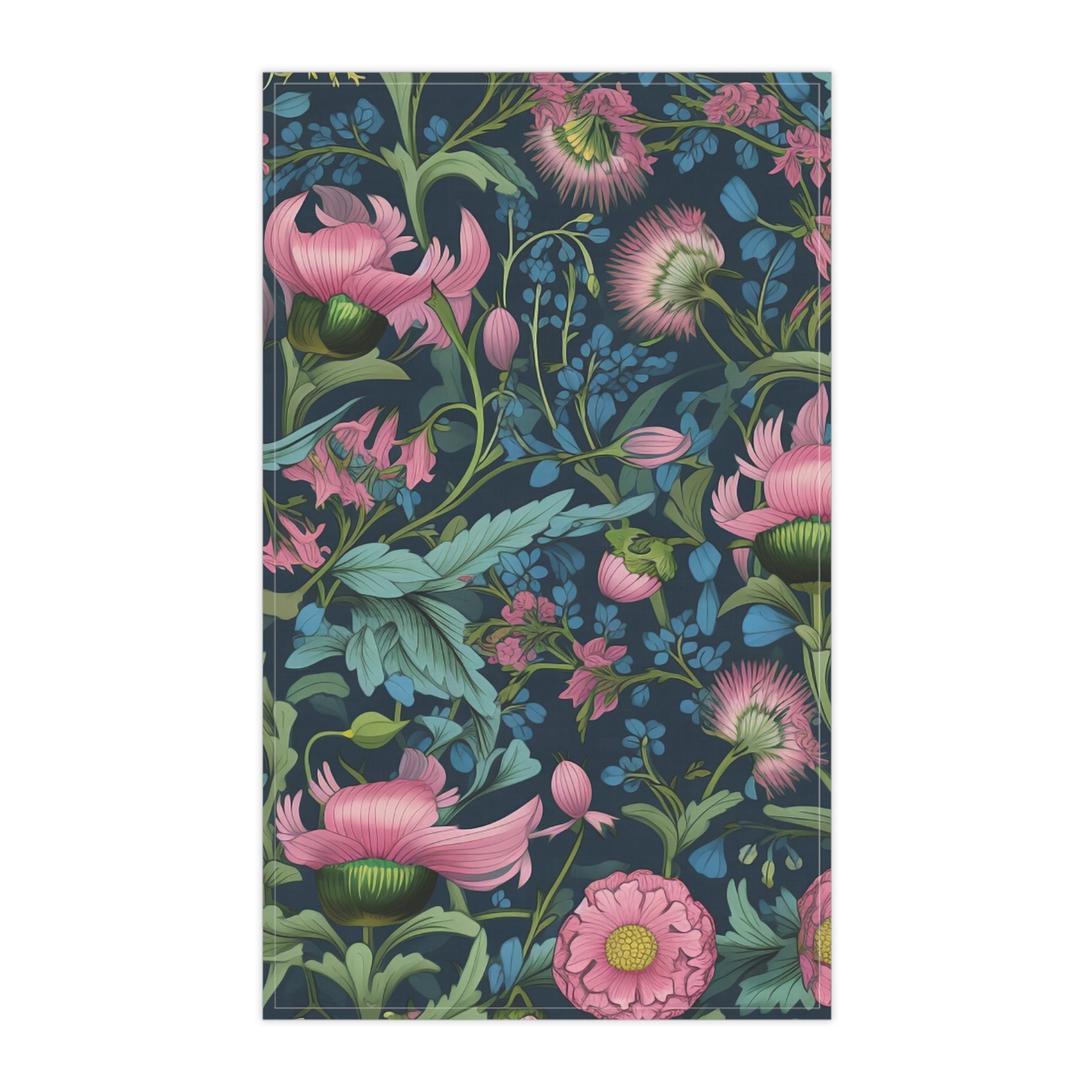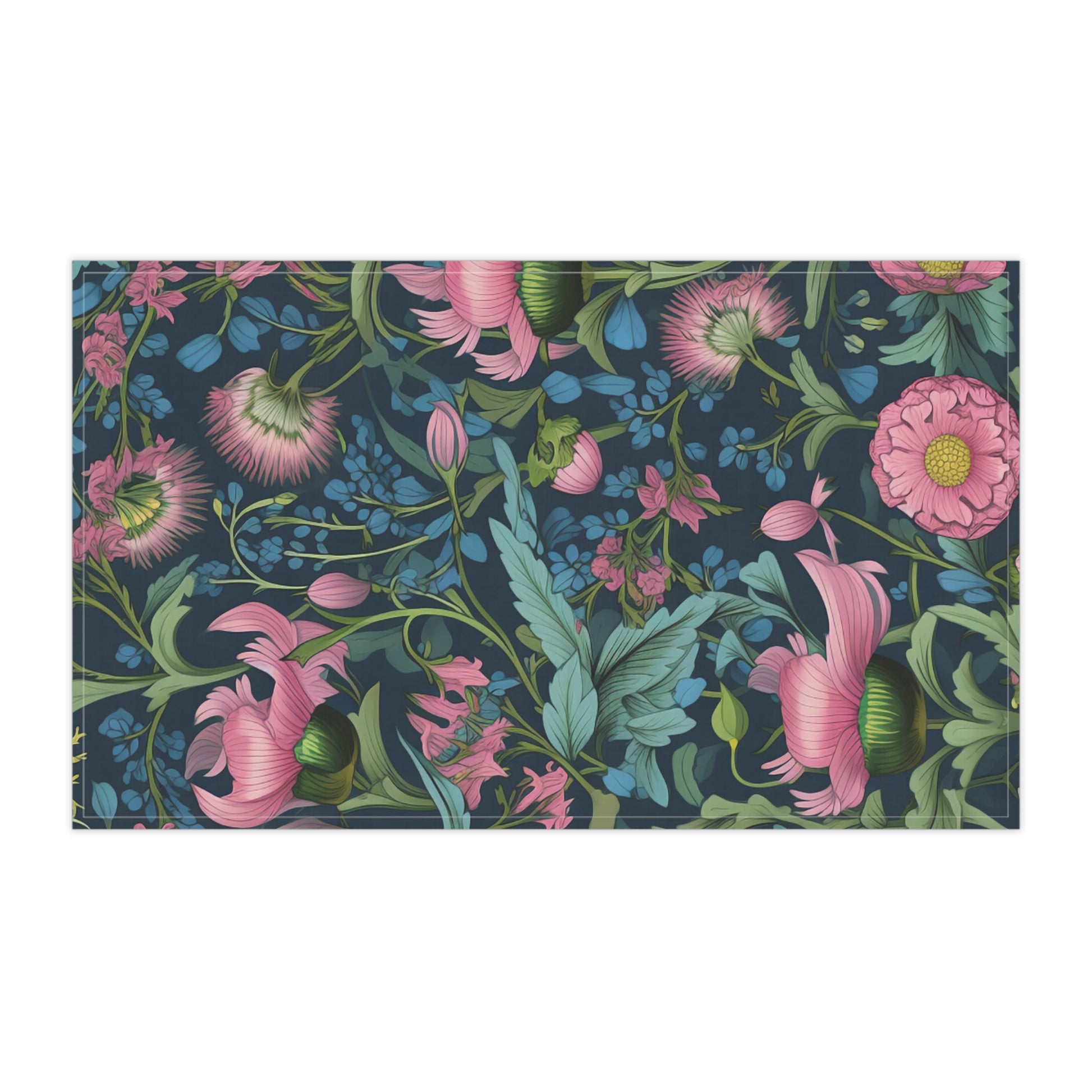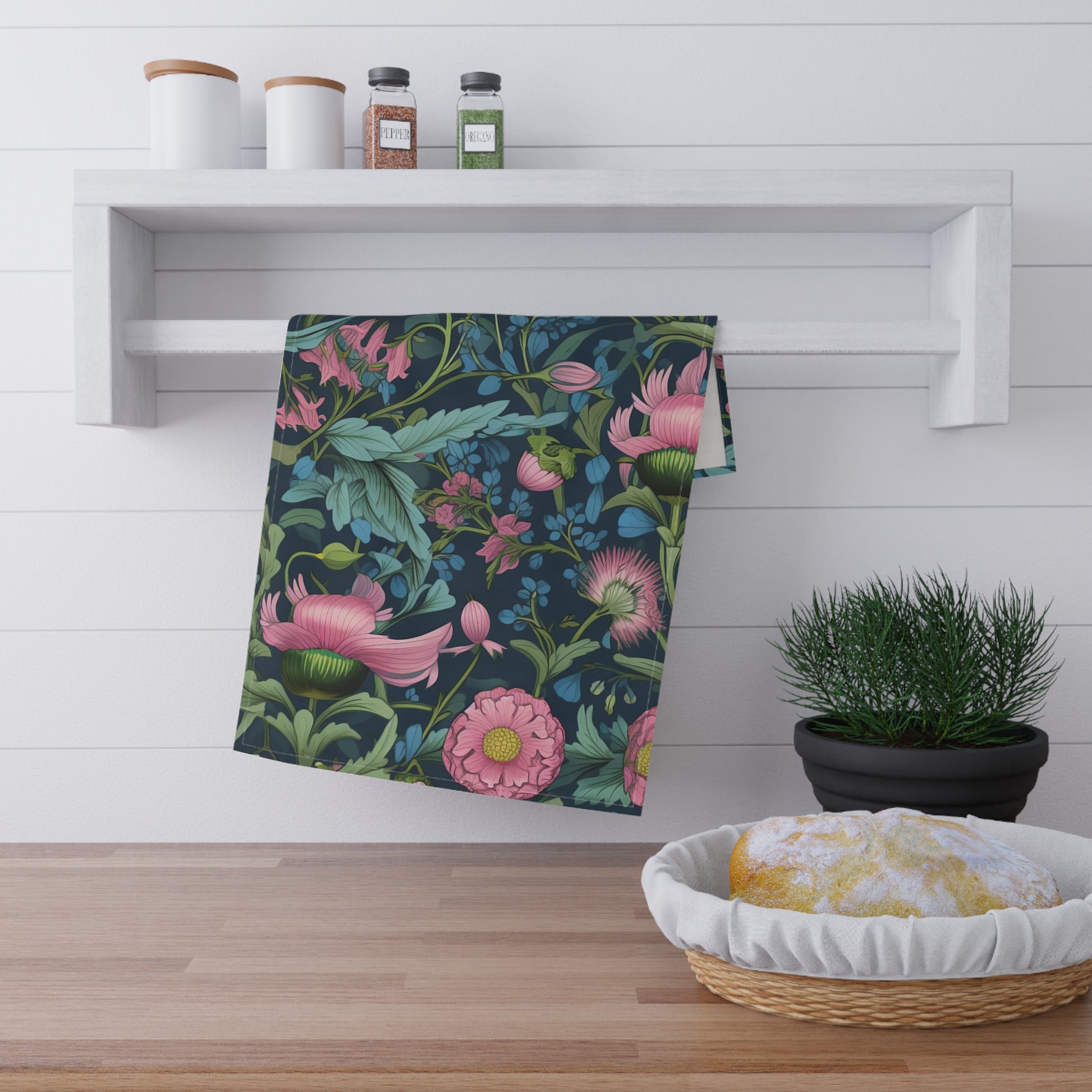 Bring a quiet garden moment into your kitchen with this floral tea towel. Soft, painterly blossoms and curling leaves bloom across a deep, moody background — it reads like a pocket of calm when you fold it over an oven handle or drape it beside a sink. The design feels both vintage botanical and contemporary, so it slips easily into a cottage-style counter or a modern dark-toned kitchen. Lightweight and absorbent, it handles everyday spills while keeping your space feeling curated and cared for.