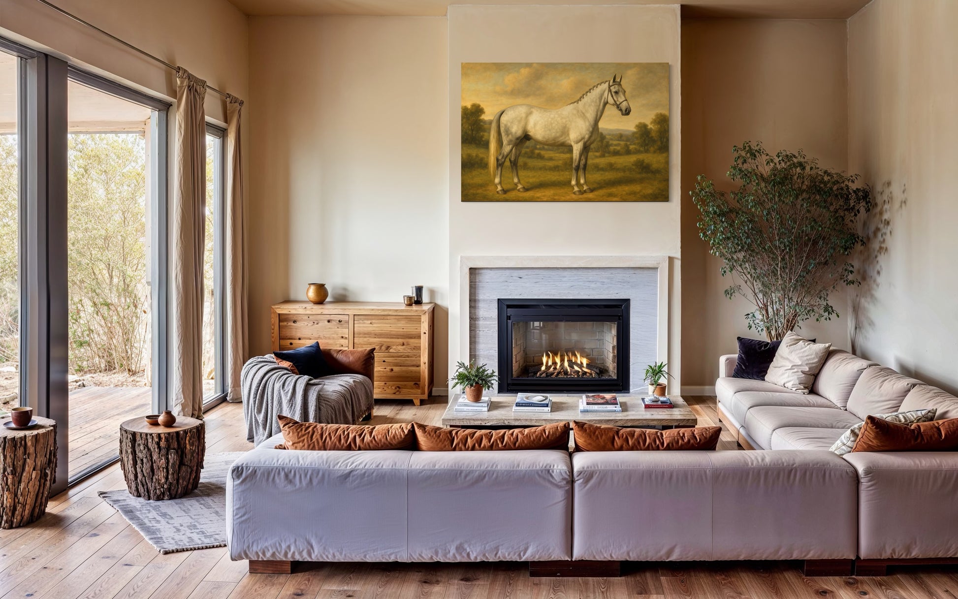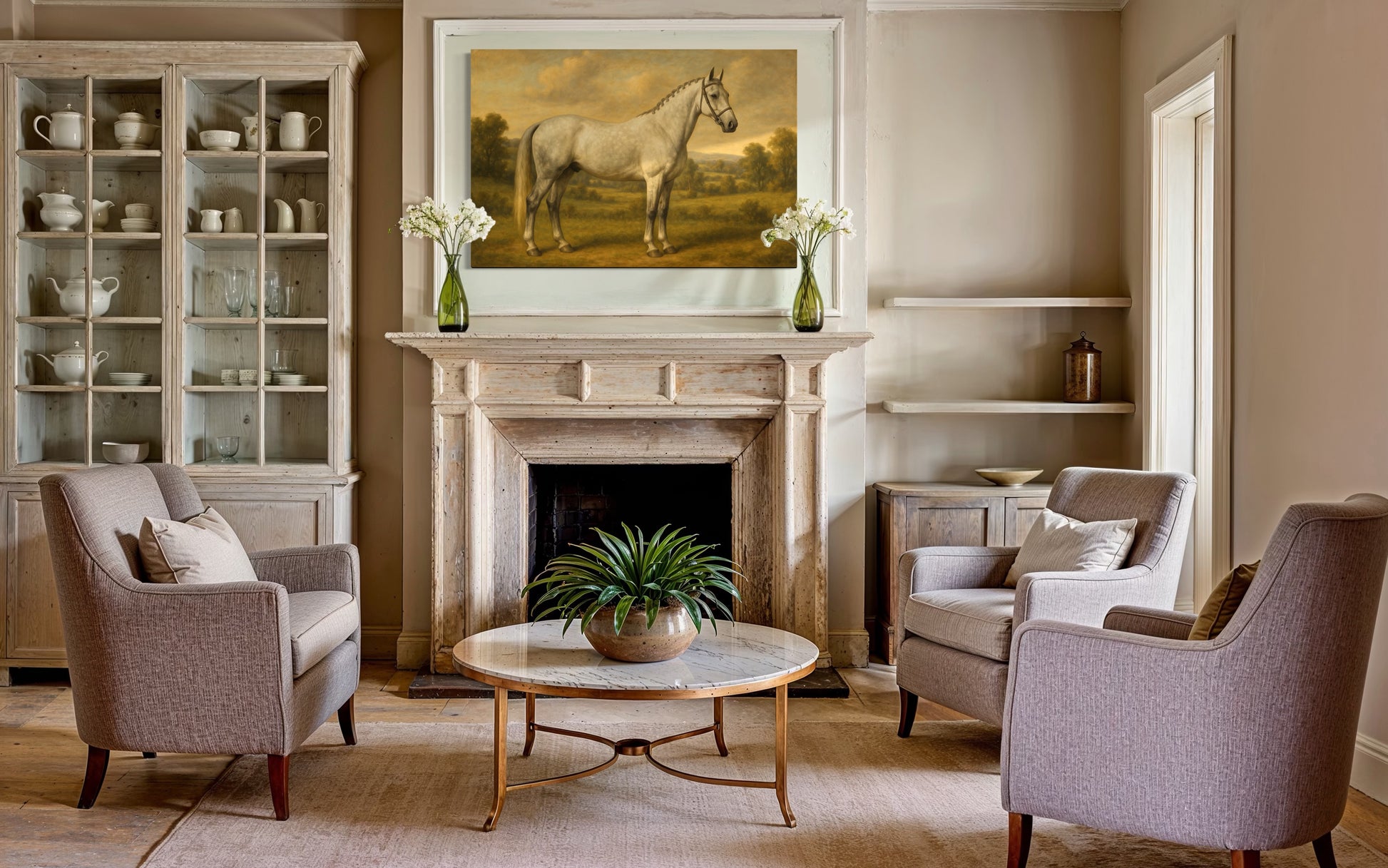 A classic equestrian portrait featuring a beautiful grey horse standing in a peaceful countryside landscape. Soft golden tones, gentle shading, and vintage styling make this artwork perfect for farmhouse décor, traditional interiors, offices, and horse-lover homes.