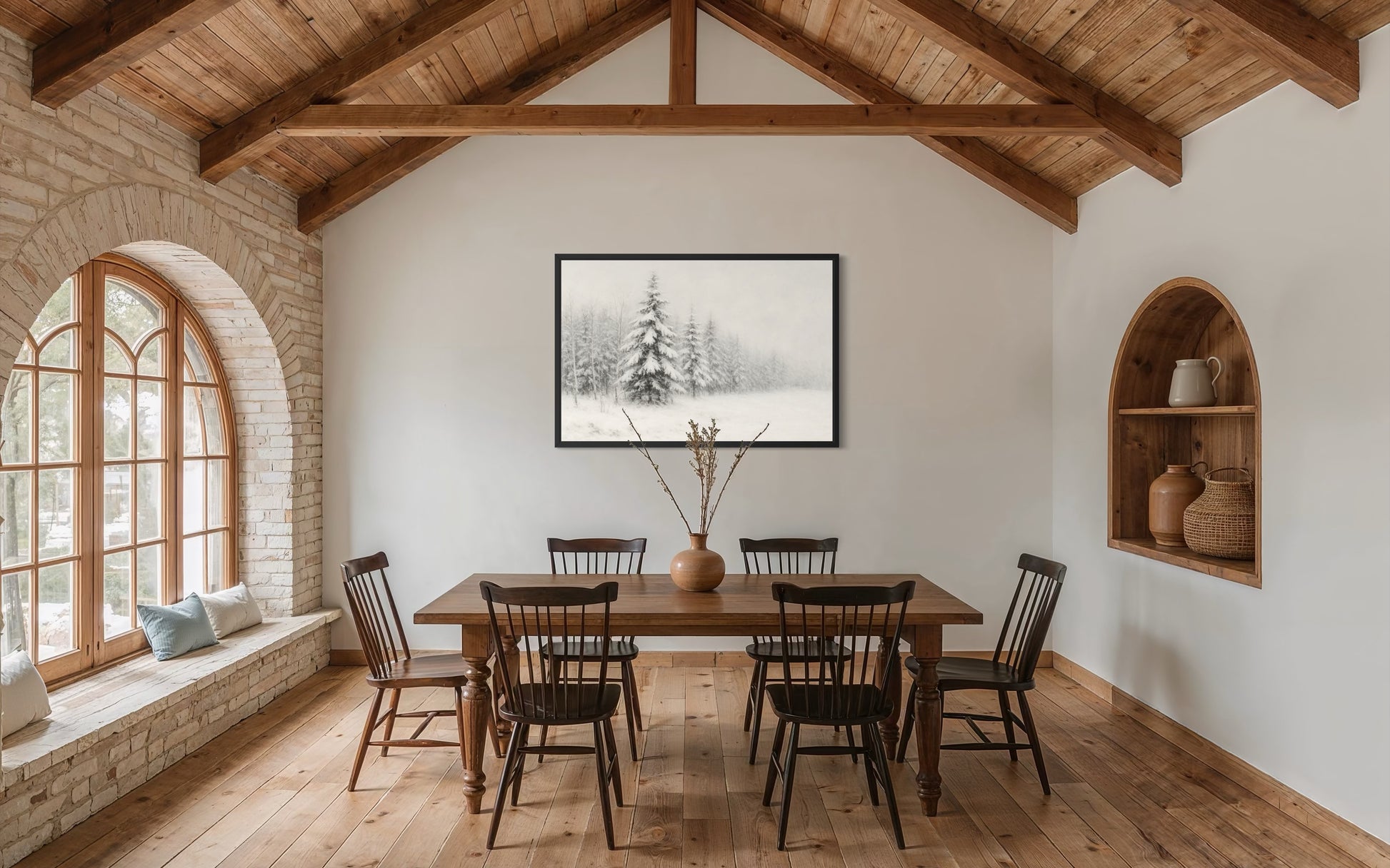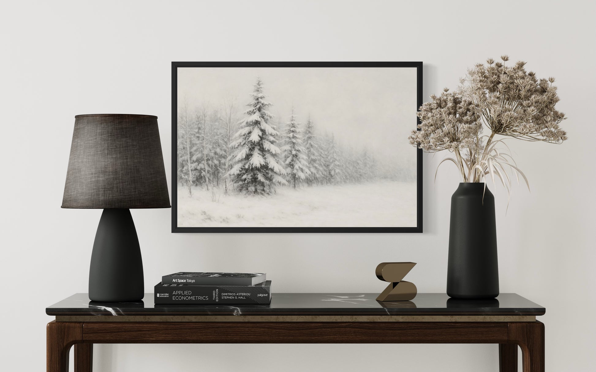 Create a peaceful winter atmosphere in your home with this soft, snowy forest scene. Tall pine trees fade gently into the mist, capturing the quiet beauty of a fresh snowfall. Perfect for neutral, minimalist, Scandinavian, and holiday-inspired décor.
